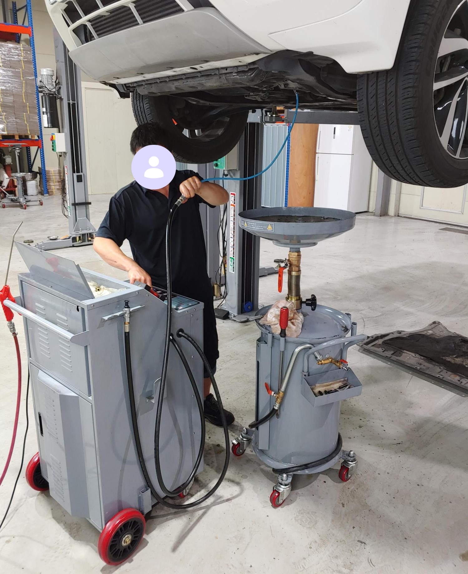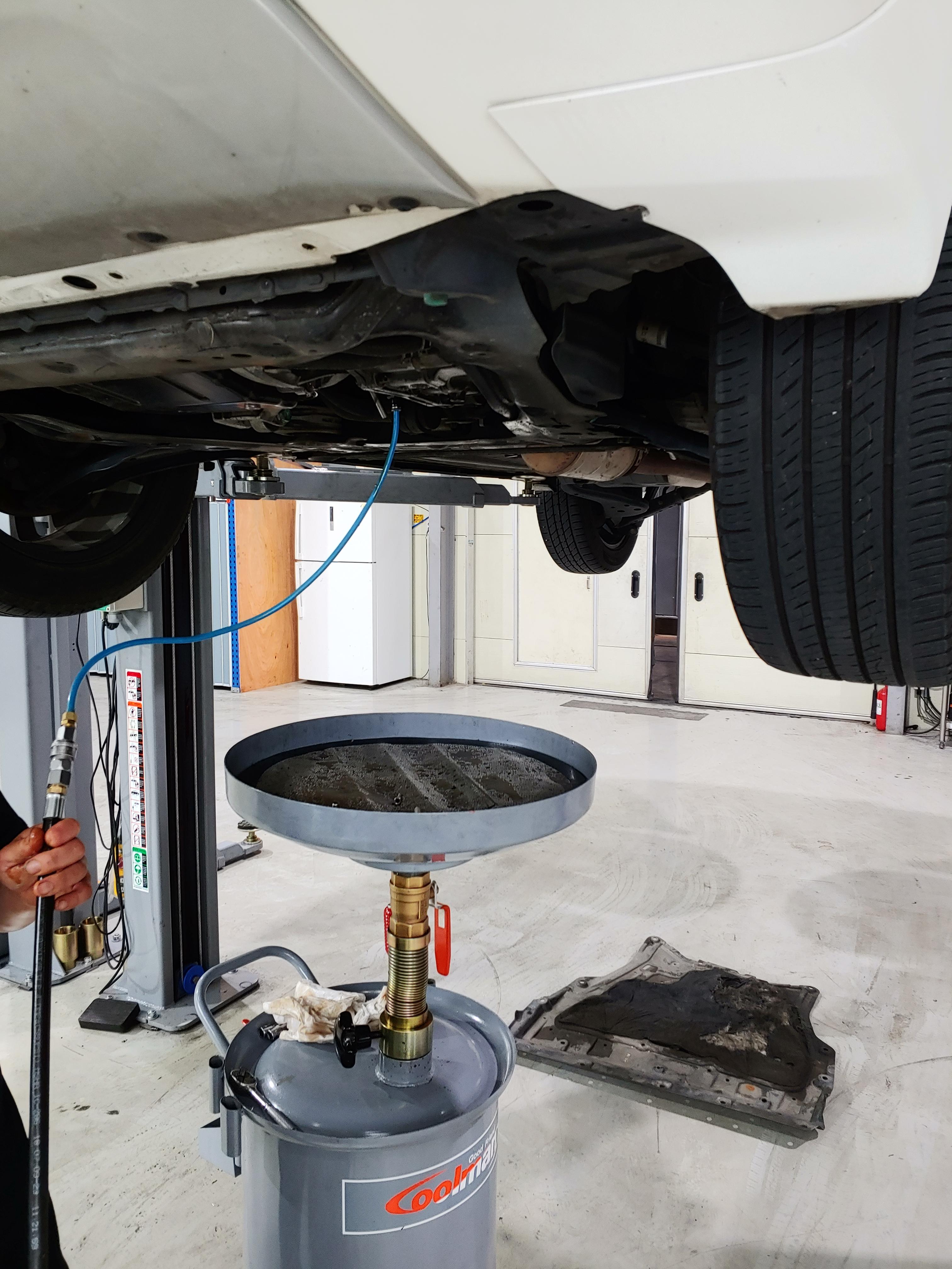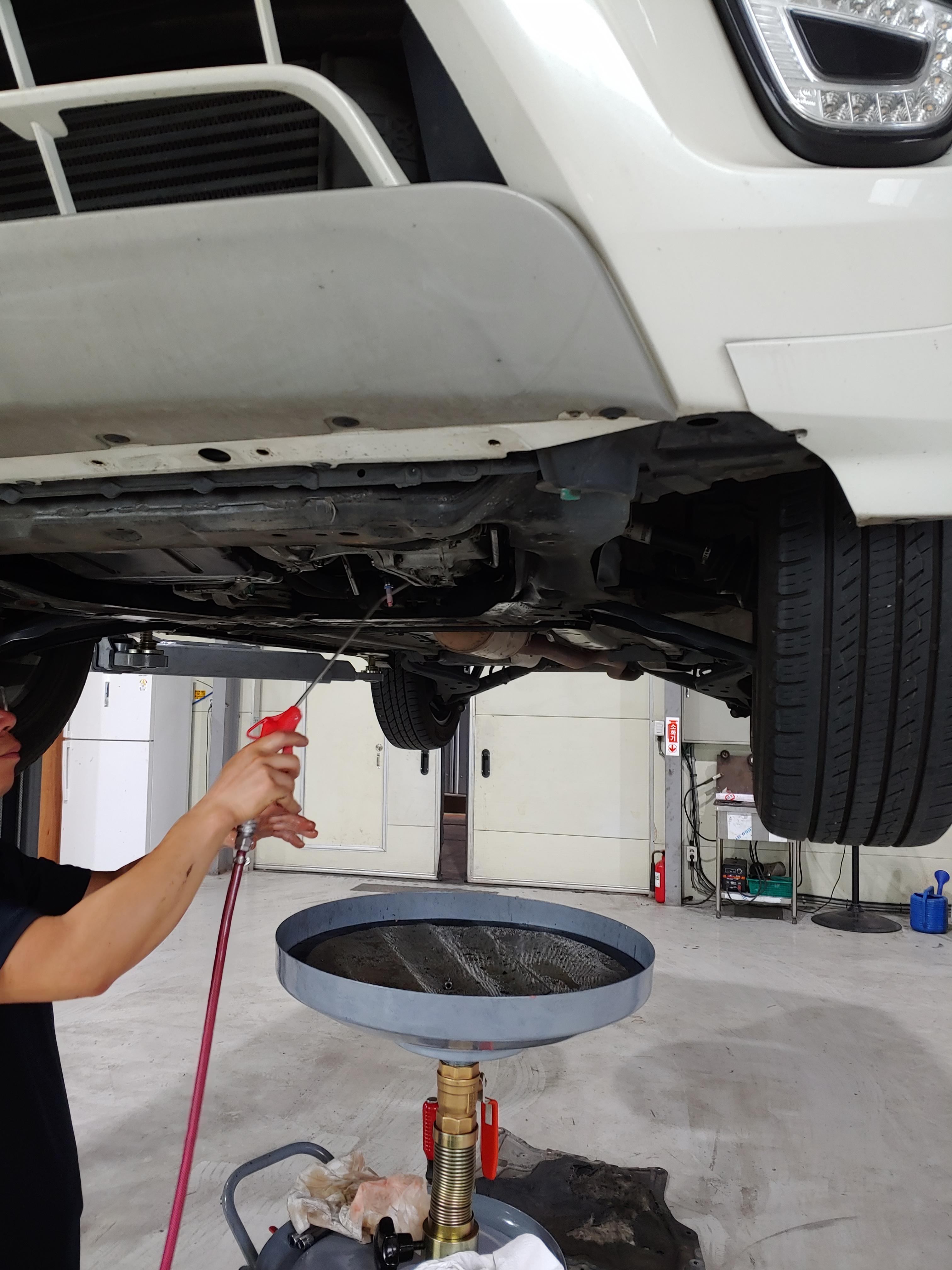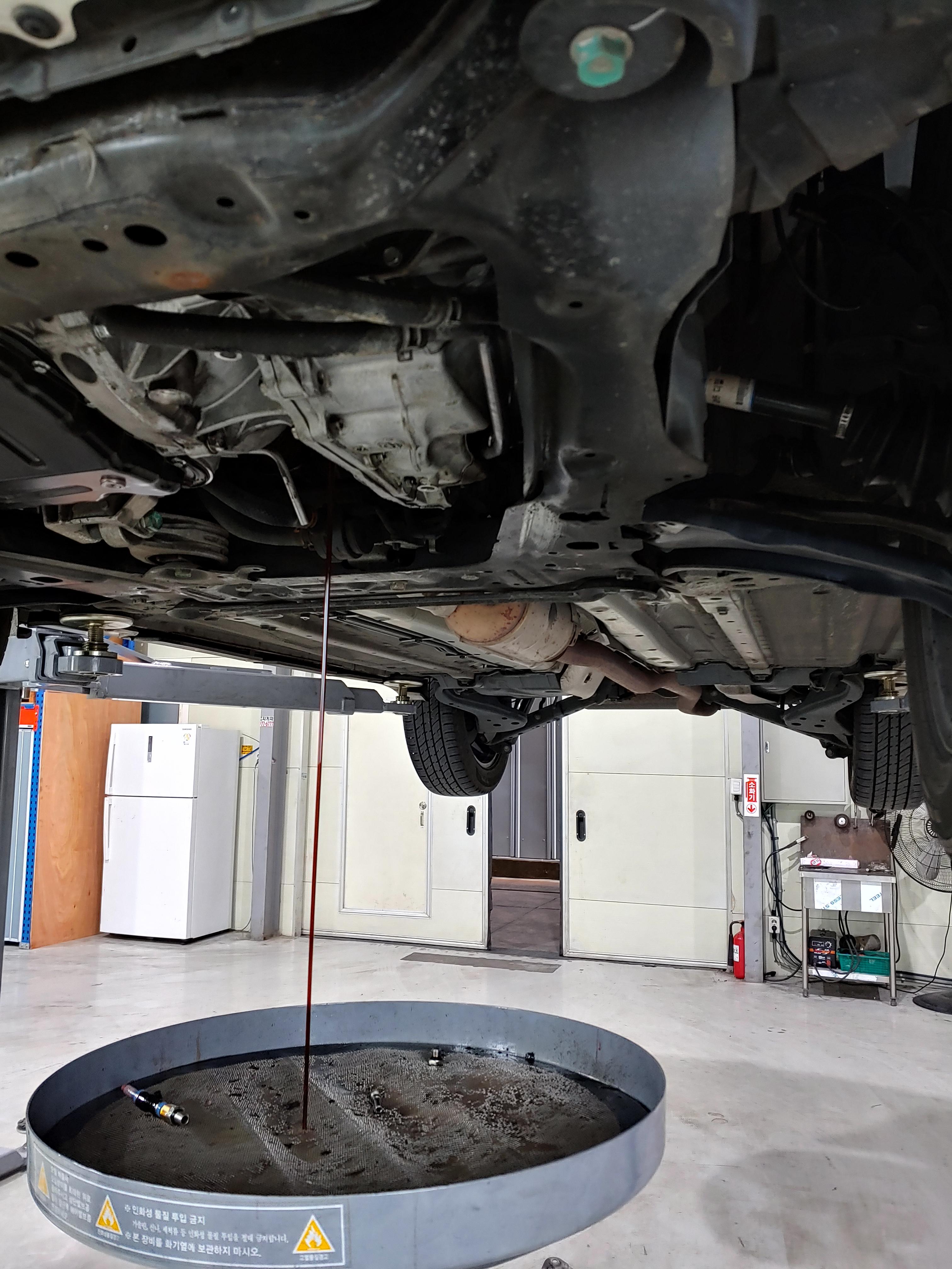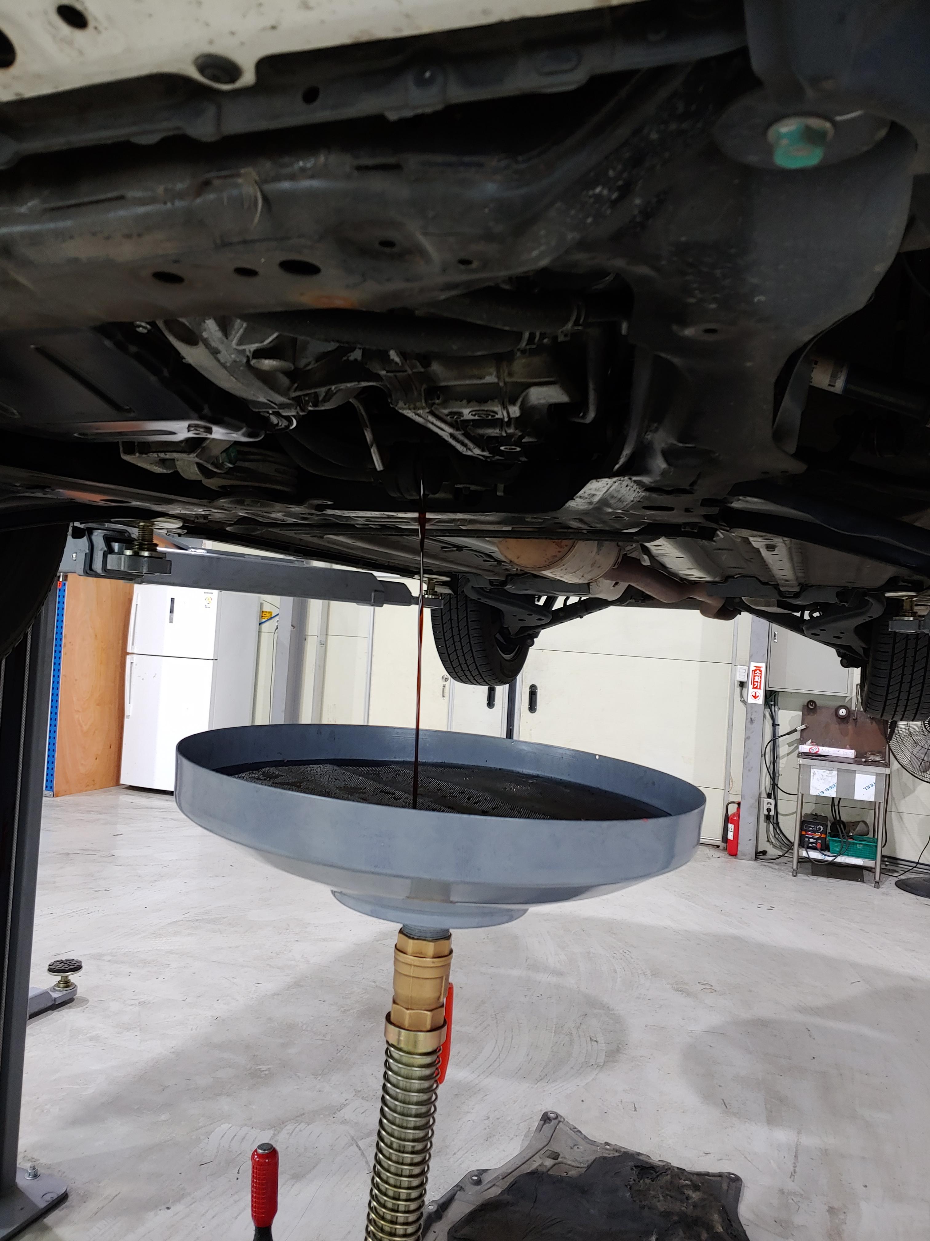 기존 미션오일이 배출되고 1차 신유를 주입합니다. 순환식 교체 기기에 전영 아답터를 설치해서 하부에서 오일을 주입하는 방식입니다. 옆에서 지켜봤는데 오일이 얼마나 주입되었는지 딱히 게이지가 보이지는 않는거 같았습니다. 정비사님께서 오일은 8리터 정도 사용(1회 4리터씩 주입)한다고 하셔서 그런가보다 하고 있습니다. 오일은 순정을 사용한다고 하셨는데 말통에 받아오셔서 어떤 오일을 사용한건지 정확한 정보는 없습니다.