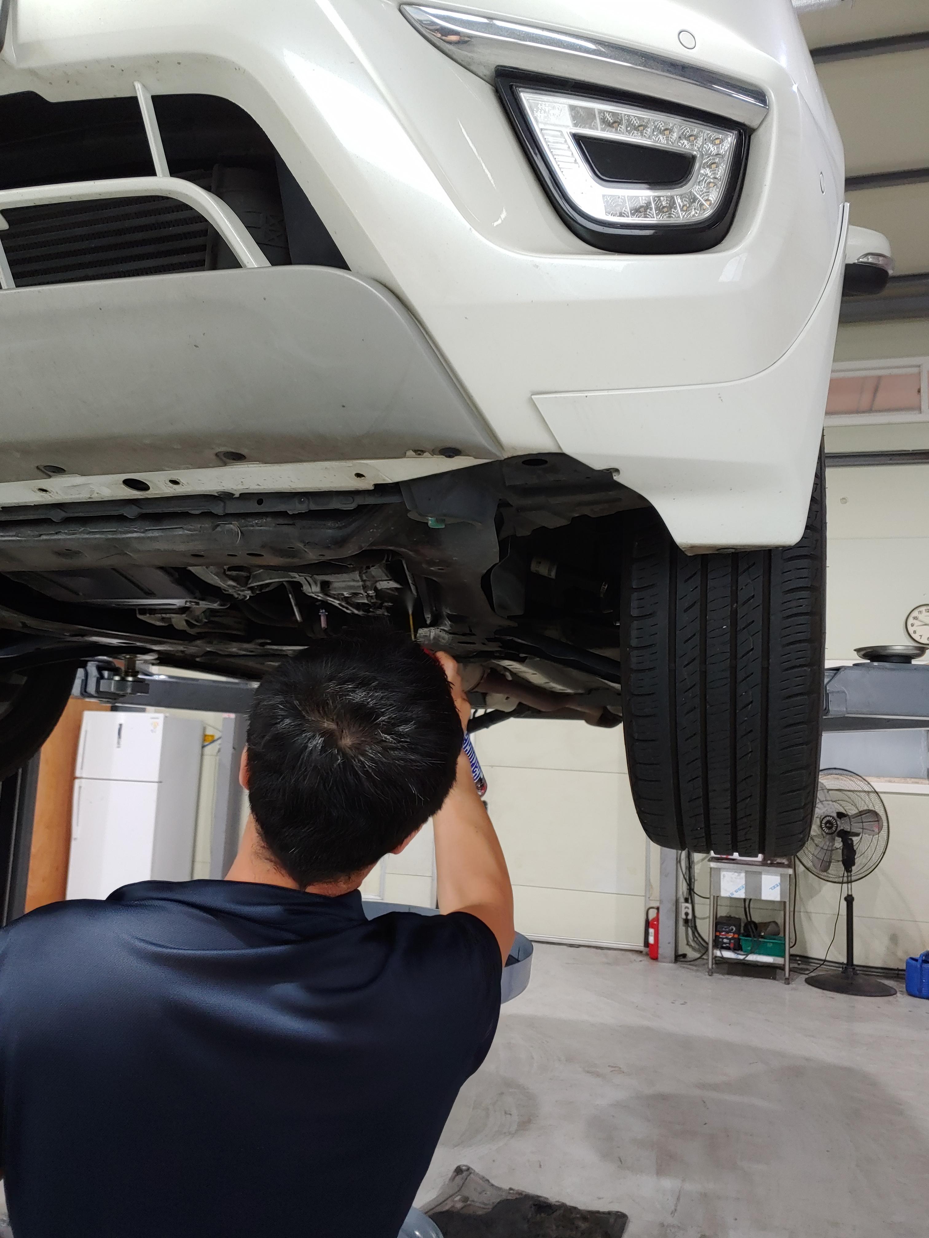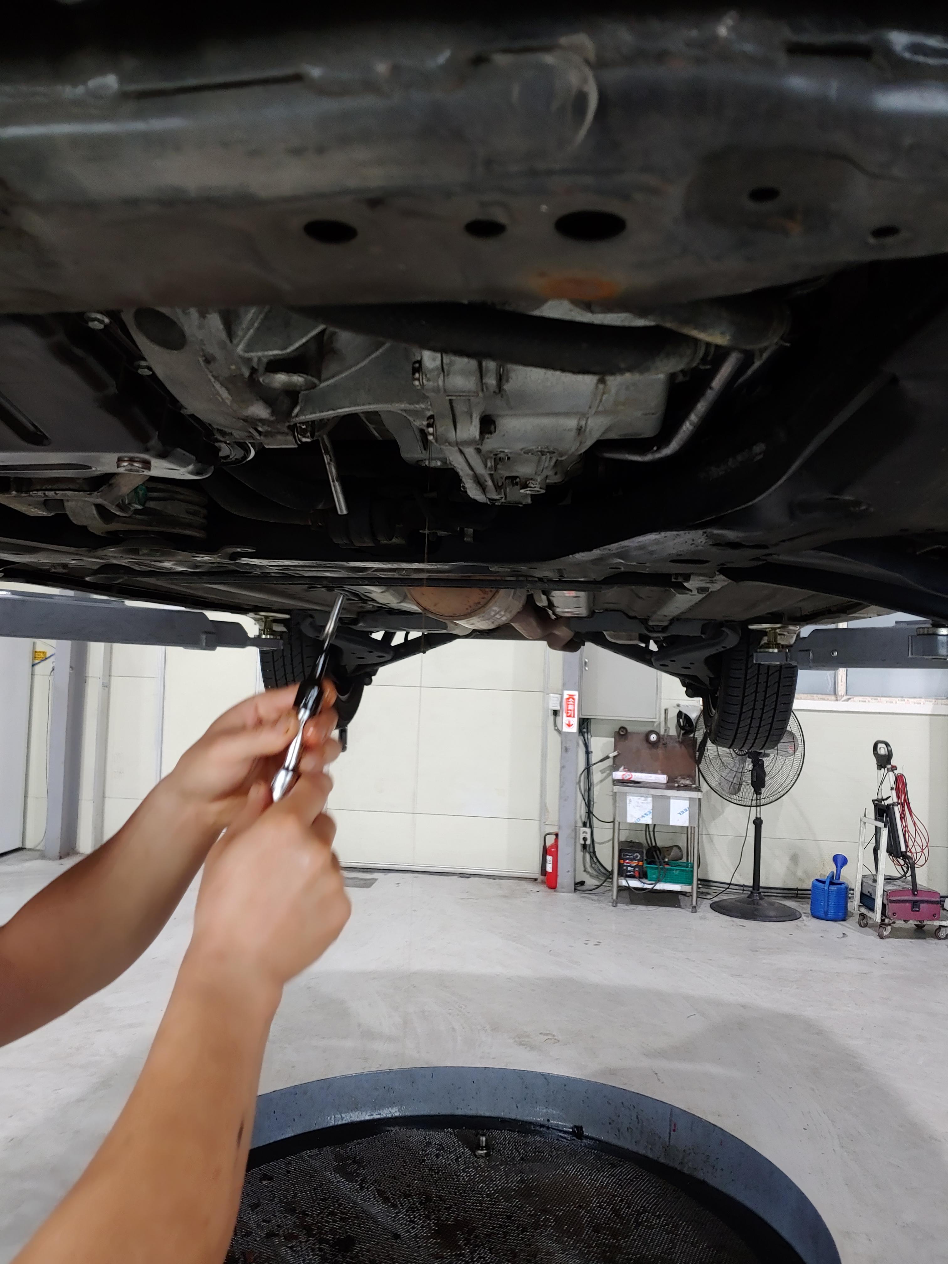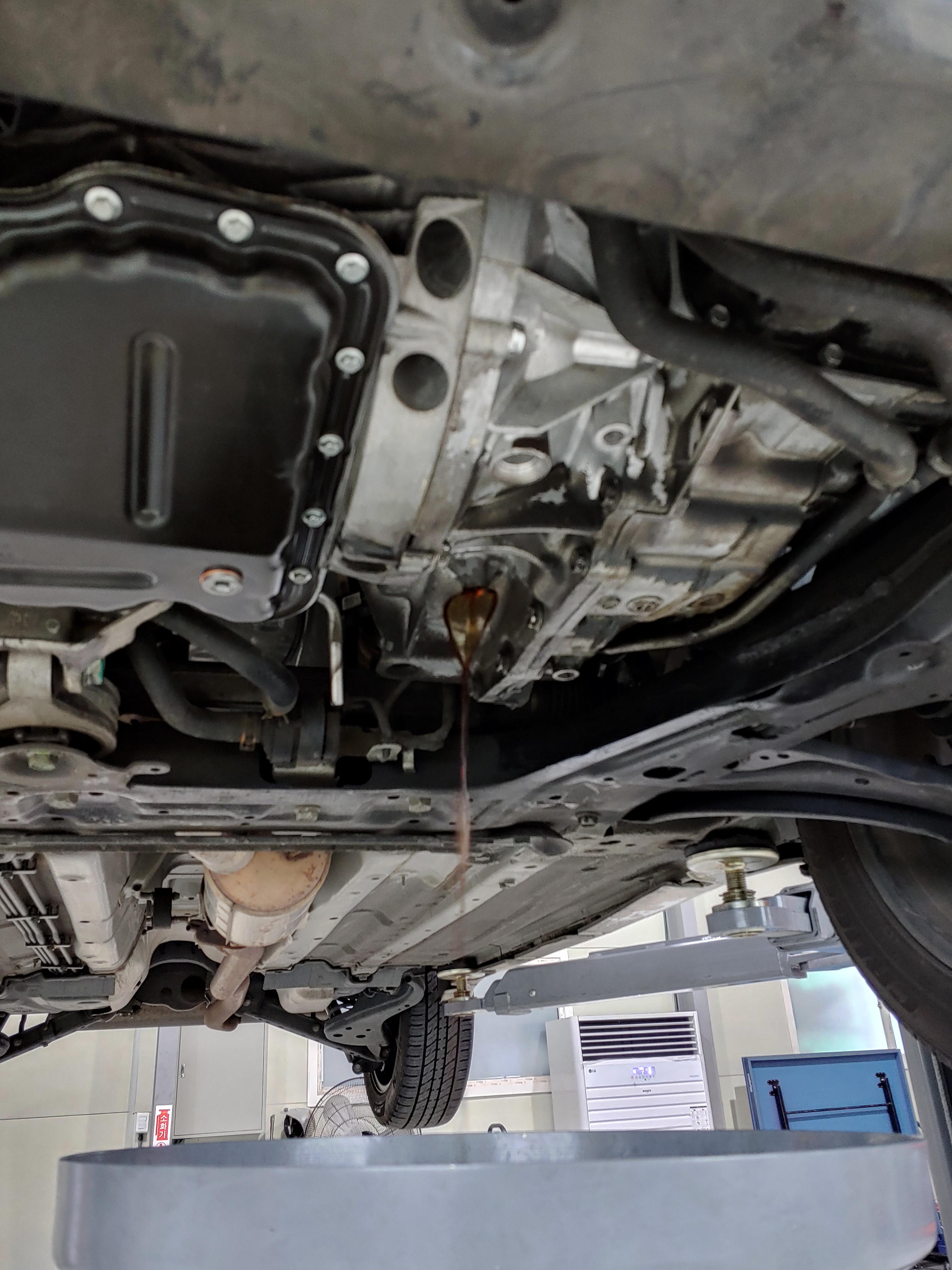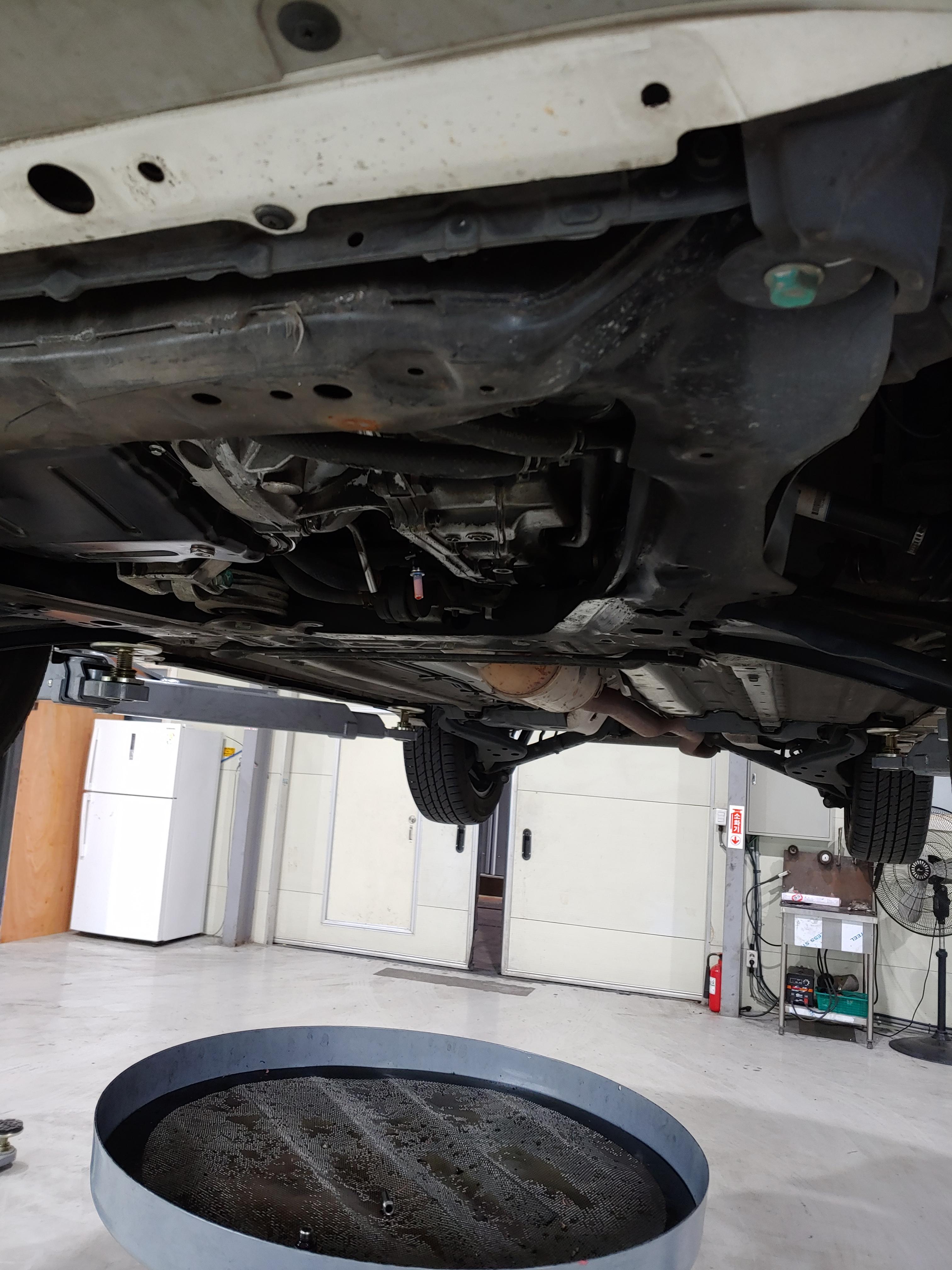 오일이 빠지는 동안 하체를 한번 둘러봤습니다. 미션쪽에 오일이 잔뜩 묻어 있는데 이건 오일 누유는 아니고 이전에 등속쪼인트가 터지면서 튄 구리스 자국입니다. 교체 후에 청소를 좀 해줬으면 좋았을텐데.. 생각해보니 닦는다고 닦았는데 좀 남았다는 얘기를 들었던거 같네요.. 근데 아래 사진을 보면 깔끔히 청소가 되어 있을겁니다.. 사소하지만 카센터에 대한 신뢰도가 하락하는 사항입니다.