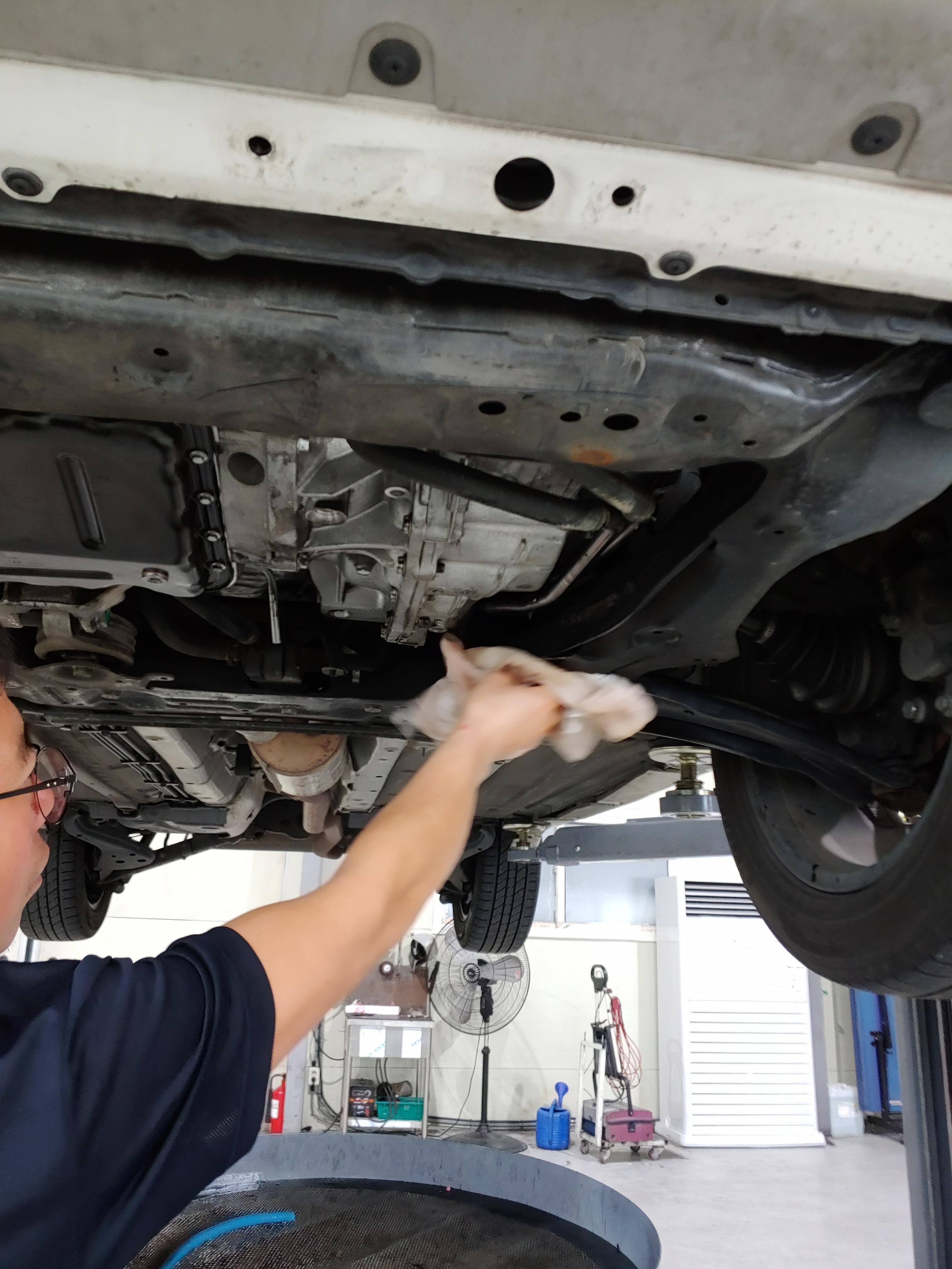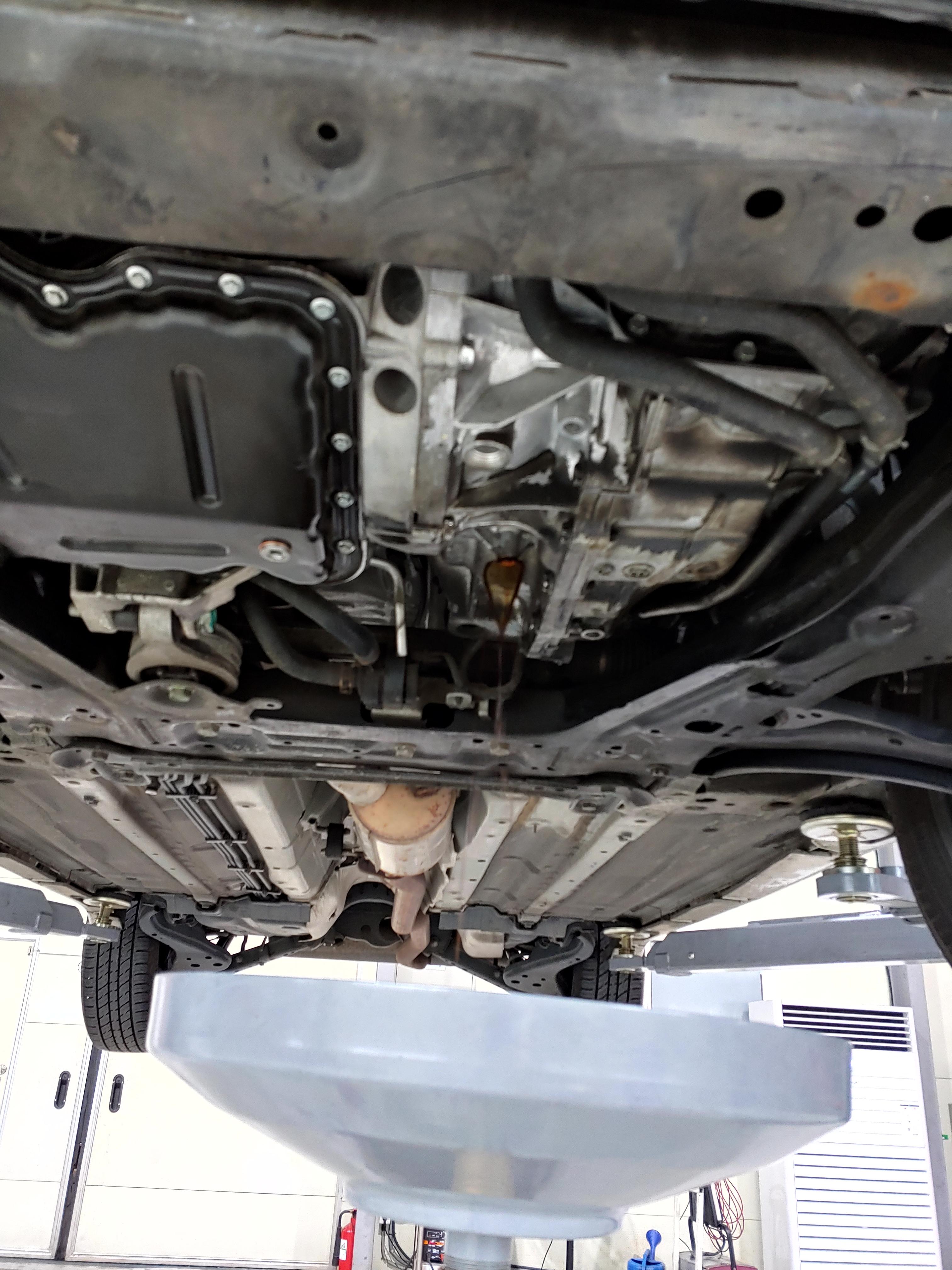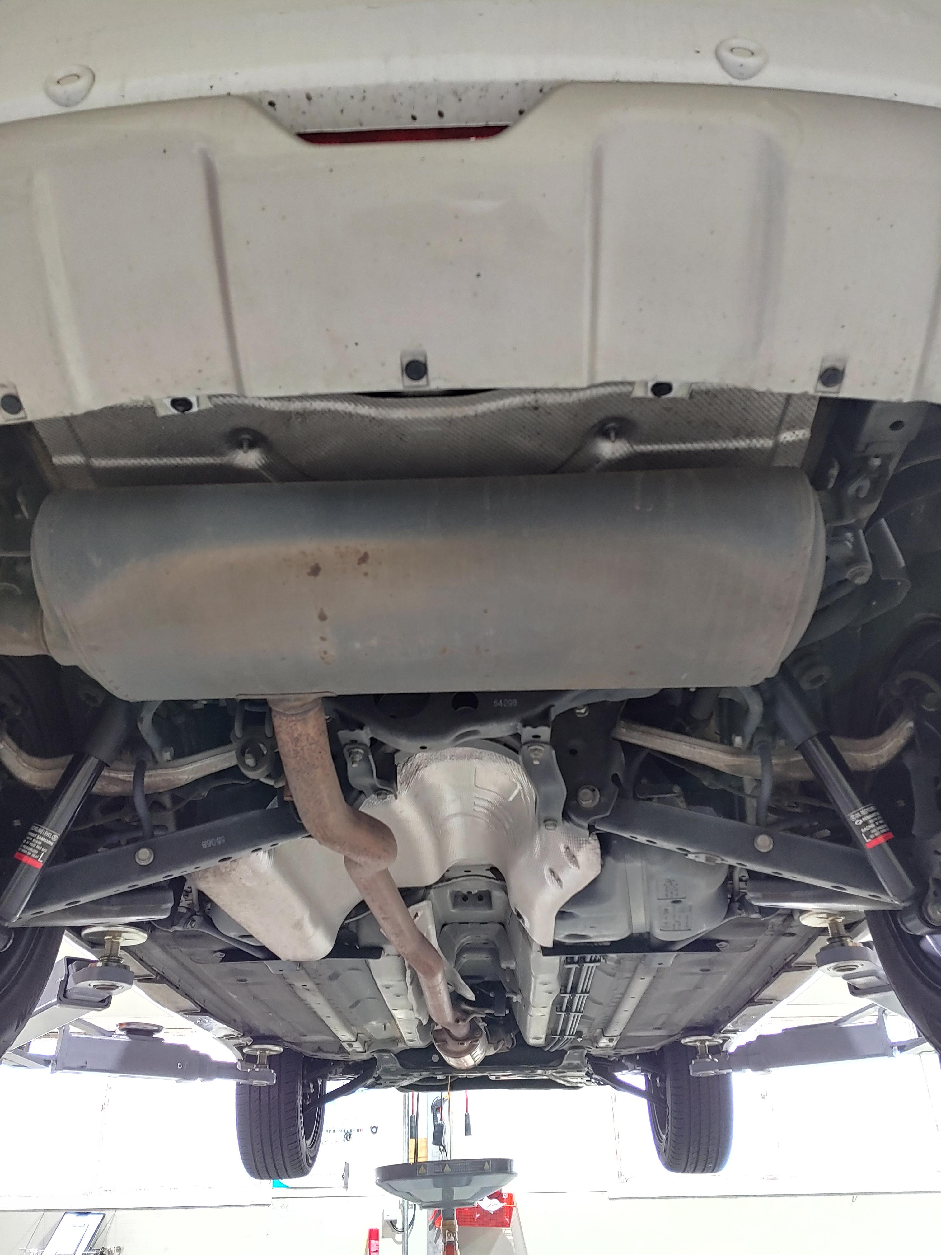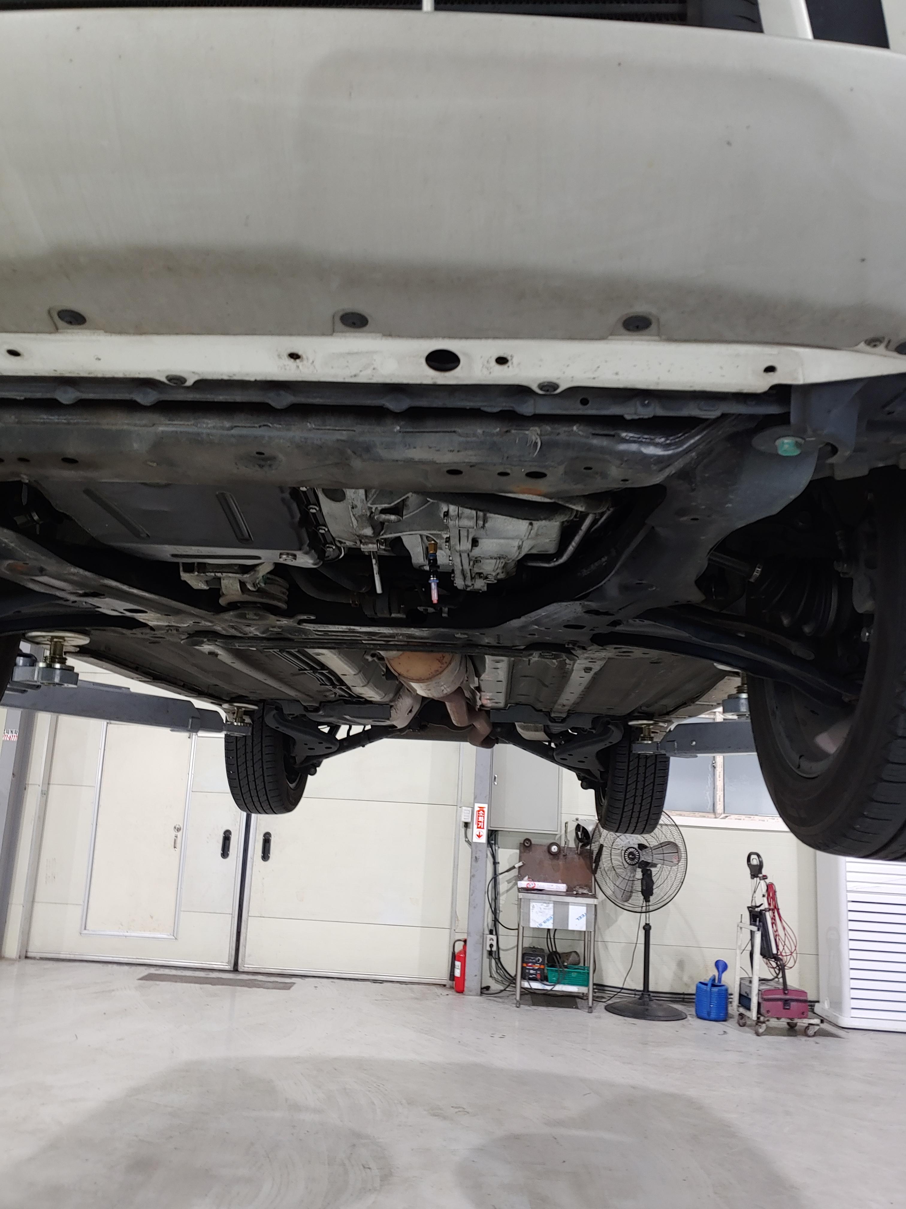 오일이 빠지는 동안 하체를 한번 둘러봤습니다. 미션쪽에 오일이 잔뜩 묻어 있는데 이건 오일 누유는 아니고 이전에 등속쪼인트가 터지면서 튄 구리스 자국입니다. 교체 후에 청소를 좀 해줬으면 좋았을텐데.. 생각해보니 닦는다고 닦았는데 좀 남았다는 얘기를 들었던거 같네요.. 근데 아래 사진을 보면 깔끔히 청소가 되어 있을겁니다.. 사소하지만 카센터에 대한 신뢰도가 하락하는 사항입니다.