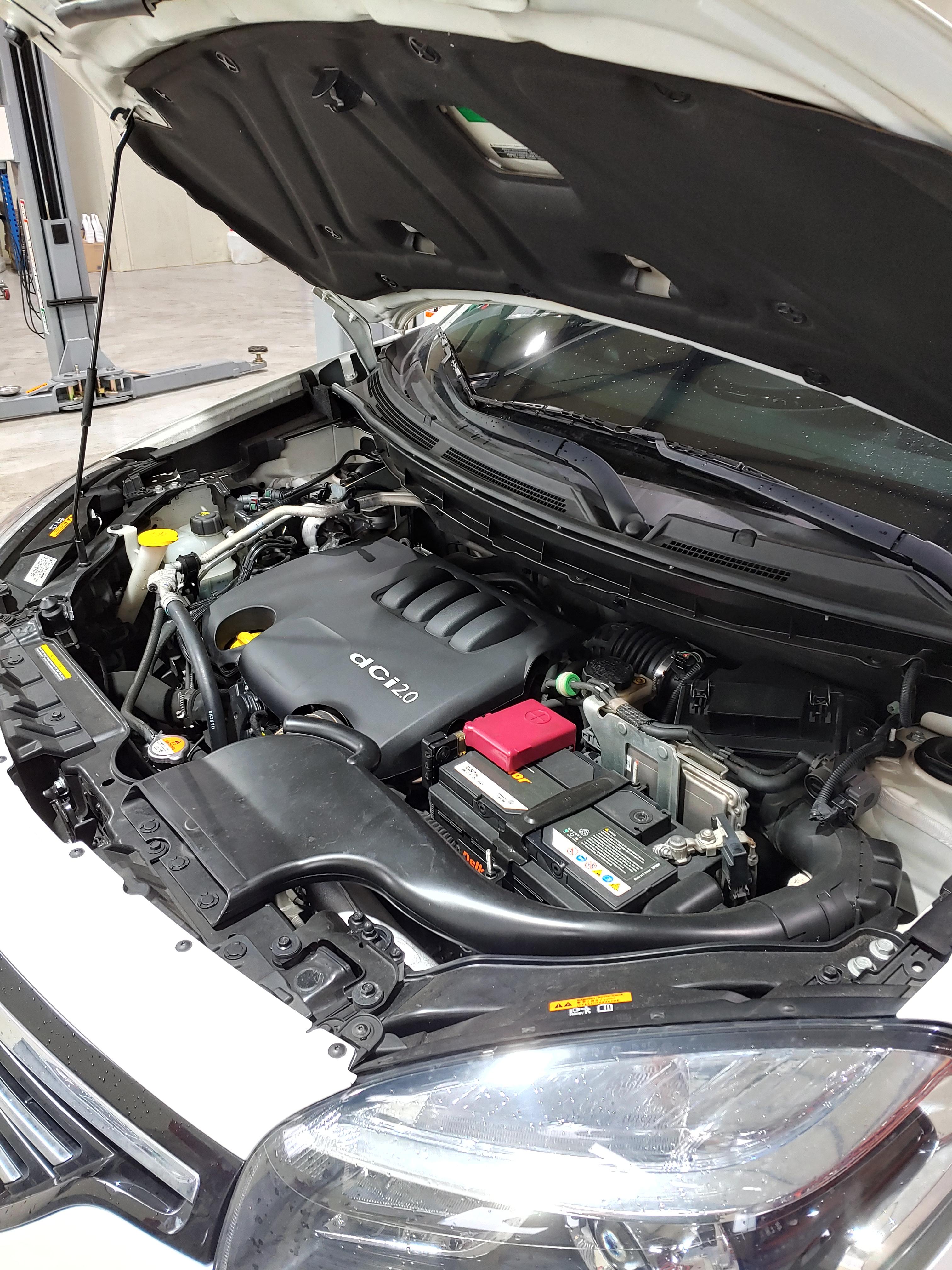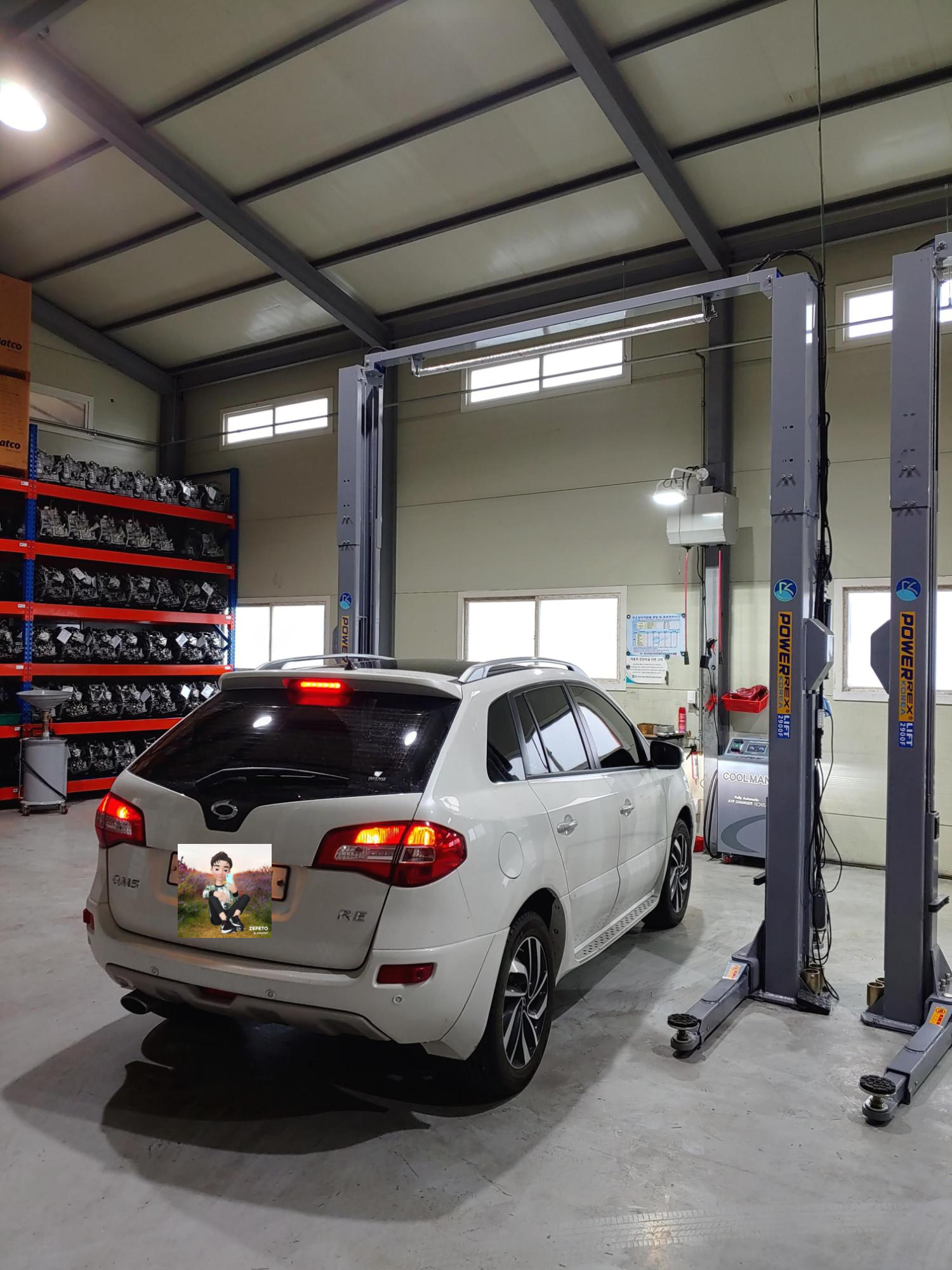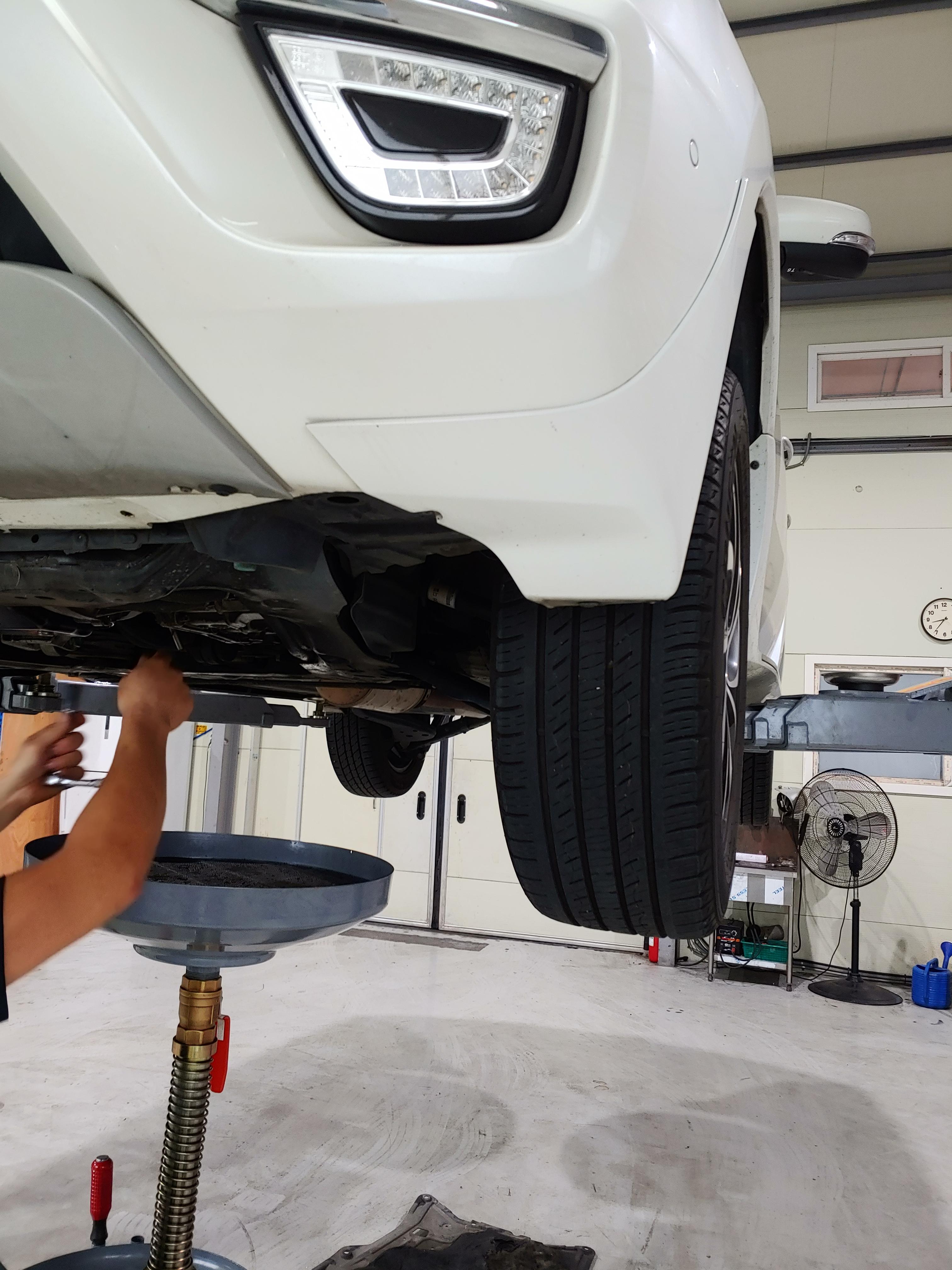 차량을 리프트에 띄우고 작업을 시작합니다. QM5의 경우 미션오일 교체시 주입을 위해 보통 베터리쪽 부품을 탈거해서 작업을 하는데 신성오토의 경우 아답터를 사용해서 하부로 오일을 주입합니다.