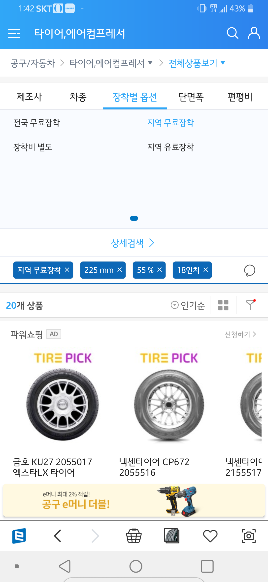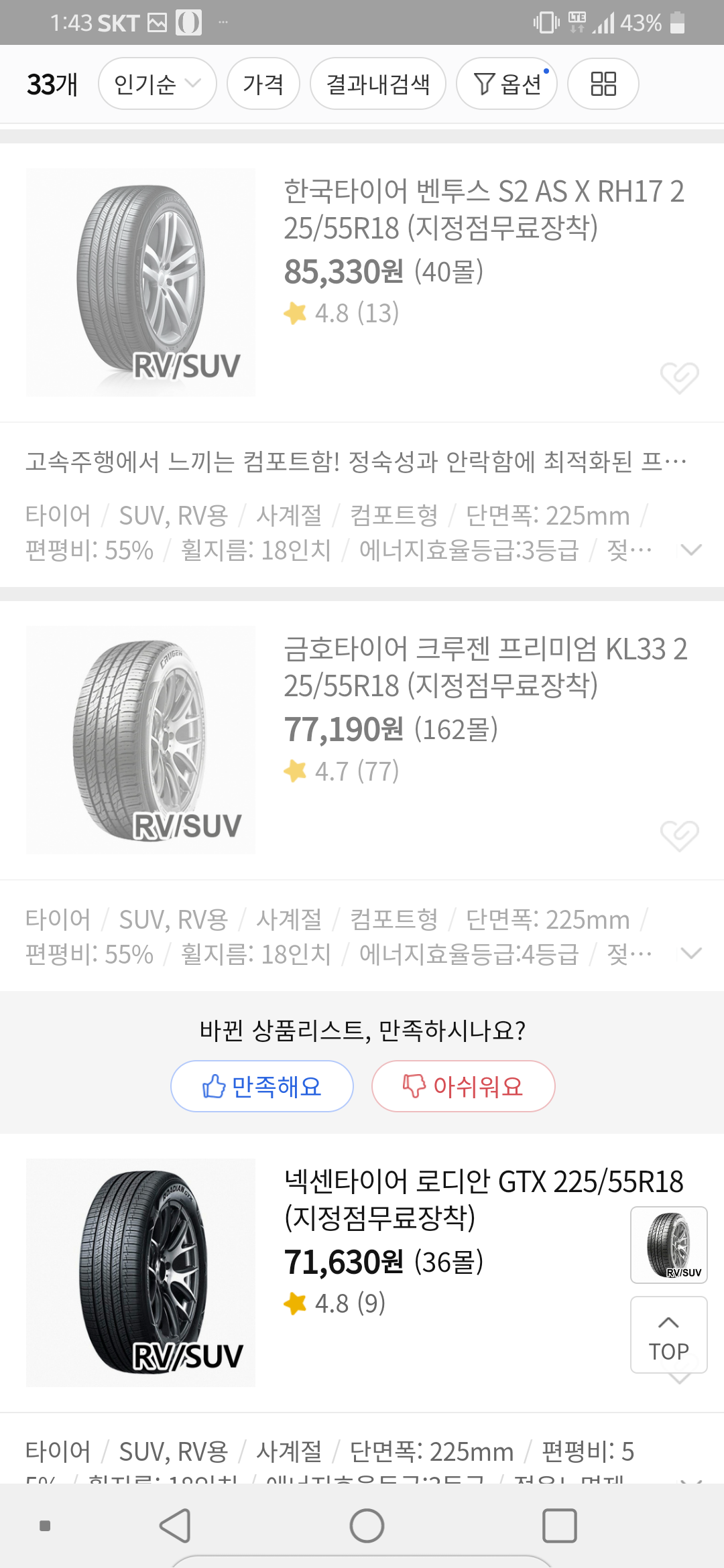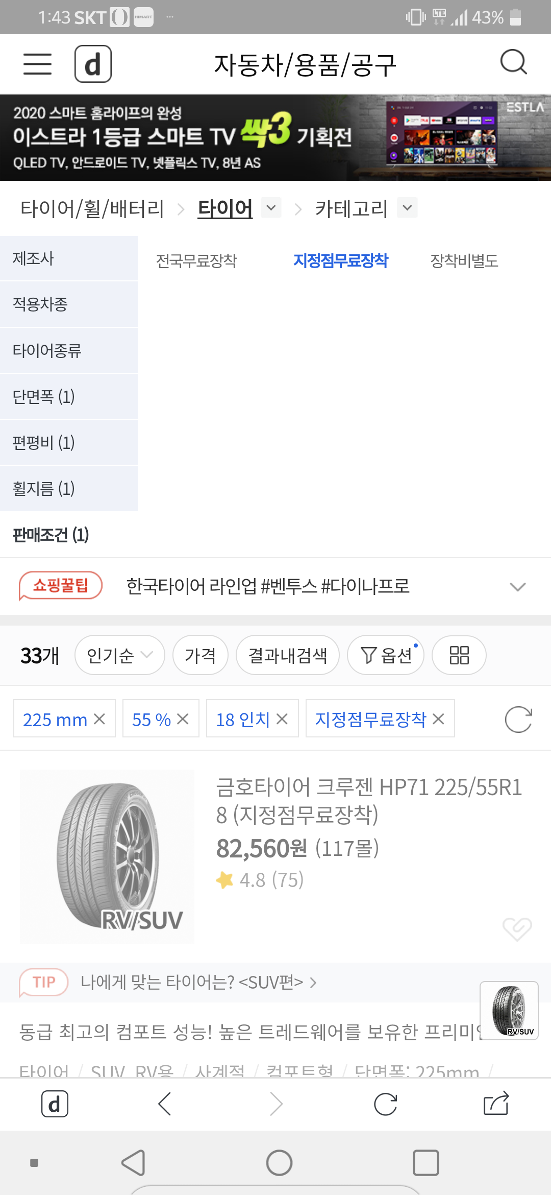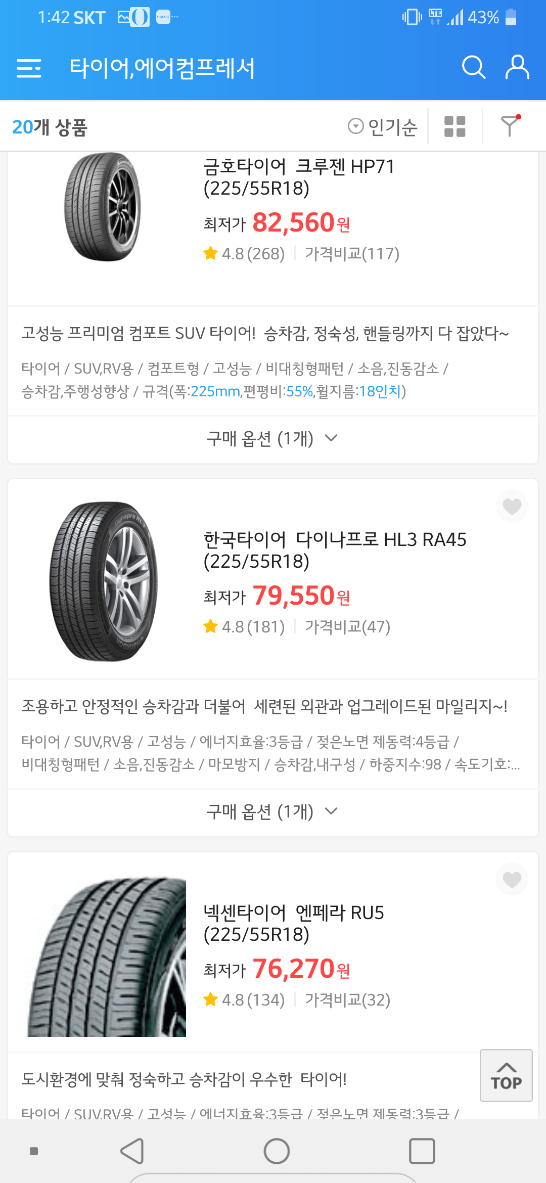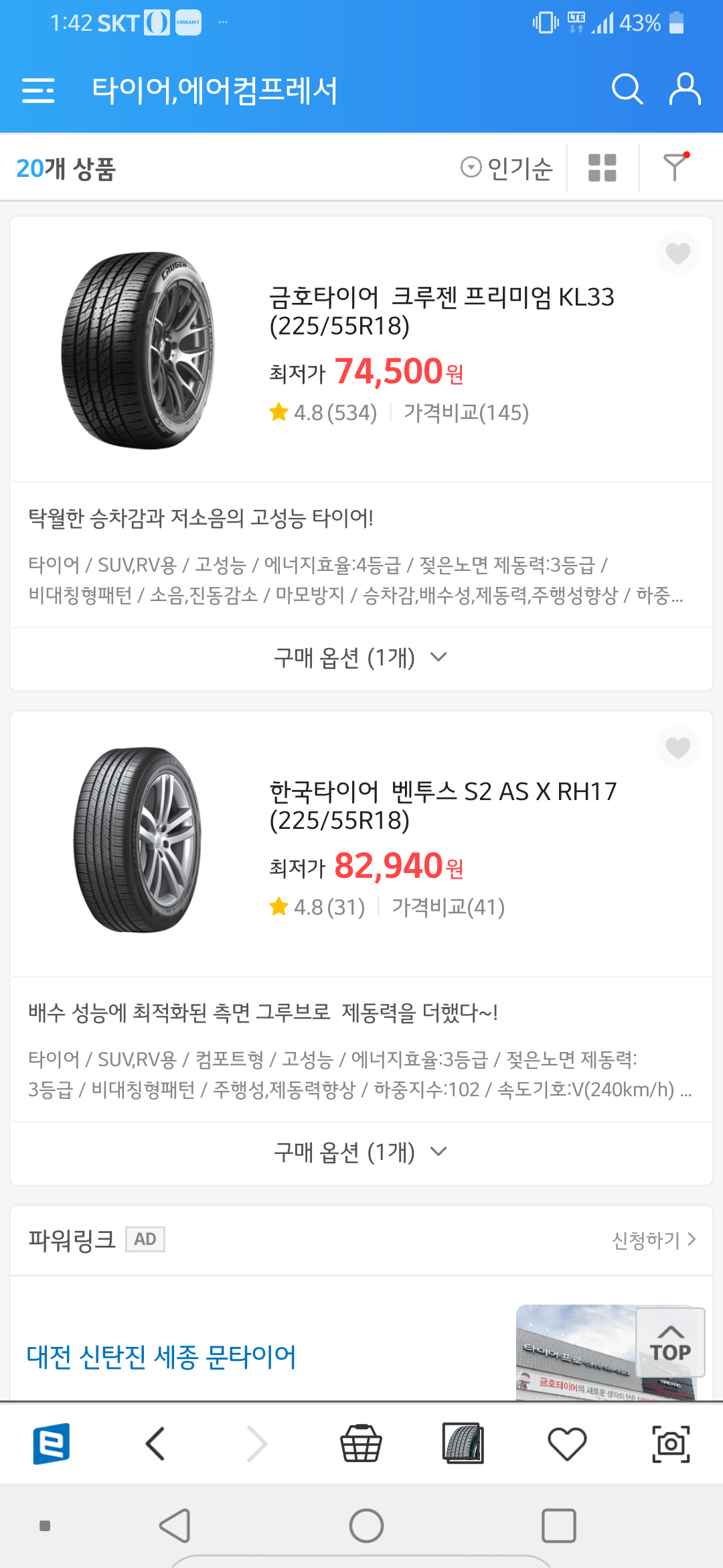 네이버 검색으로도 타이어를 찾아볼 수 있지만 찾다보니 다나와, 에누리를 사용하는게 편해서 해당 앱으로 검색한 결과만 남깁니다.