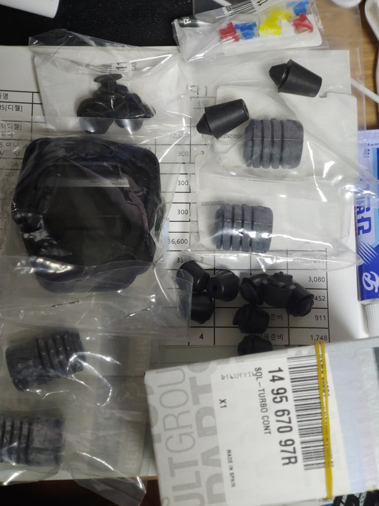 솔레노이드밸브가 2가지 종류가 있는데 개선품(10년 6월 이후)이 더 저렴하고 제 차량에 맞는 부품이라 개선품으로 주문하면서 보닛, 트렁크, 도어 고무류와 에어덕트 고정핀, 도어스트라이커 커버, 예비용 휴즈 등을 함께 주문했습니다.