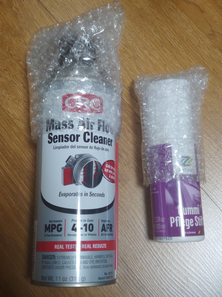 구매한 에어플로우센서 전용 클리너와 나중에 사용할 예정인 고무보호제입니다. 배송비 때문에 동일 판매자 상품 중 나중에 쓸거 같아서 함께 주문했습니다. 불량인지 클리너 옆에 빨간 빨대가 잘 껴지지 않아 연결하지 않고 작업했습니다.
