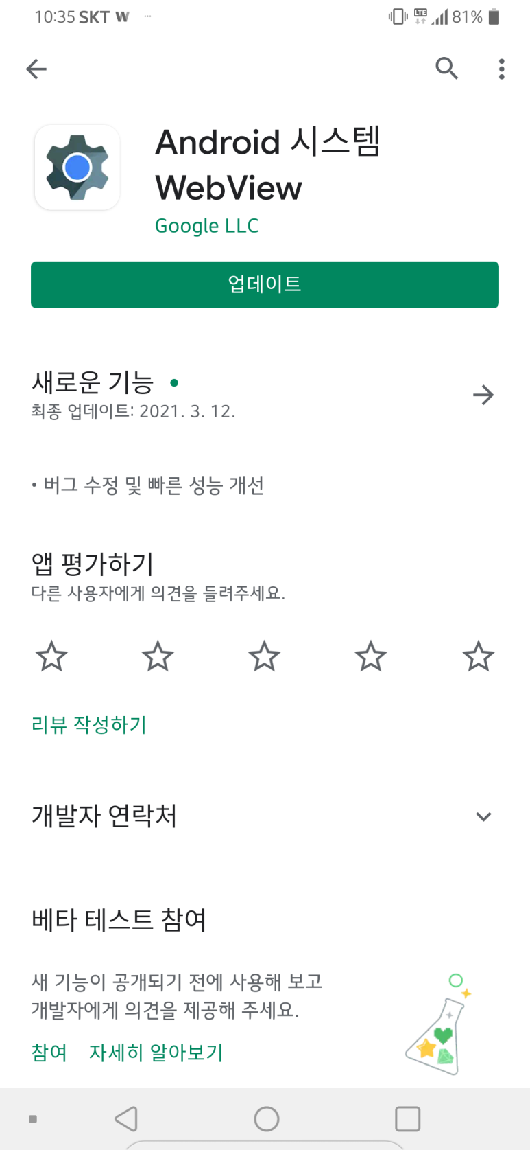 최근에 업데이트 받은 앱 중에 문제가 있는게 있는지 확인을 해봤지만 딱히 다른 앱에 영향을 줄만한건 보이지 않았는데 검색을 하다보니 구글 웹뷰(WebView) 업데이트가 문제를 일으키는거 같았습니다.