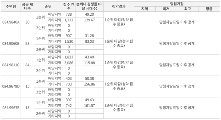 최저 31:1, 최고 161:1의 경쟁률을 보였는데 당첨가점도 다른 단지들보다 높을걸로 예산이 되네요..