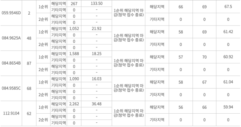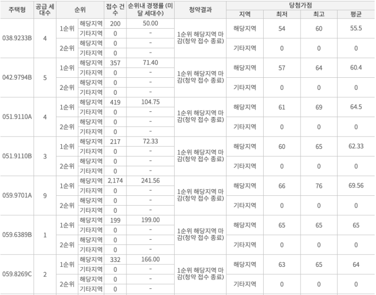 분양 물량이 적었던 59타입은 최저 63점, 최고 76점을 보였습니다.