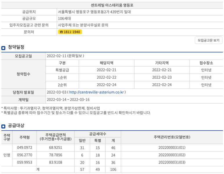 | 센트레빌 아스테리움 영등포 특별공급 청약접수 현황 (0) | 2022.02.21 |